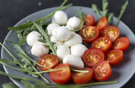 mozzarella balls with cut in half cherry tomatoes and arugula on a plate on a dark background