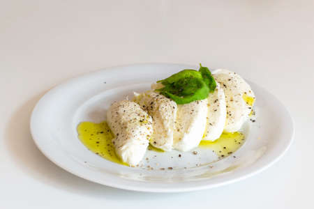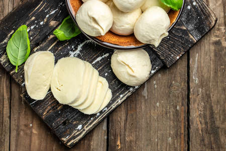 Fresh soft white italian cheese mozzarella buffalo made from Italian buffalo's milk by pasta filata method with basil