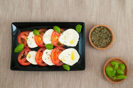 Fresh soft Italian white cheese mozzarella buffalo, original from Campania, Paestrum and Foggia regions, South Italy, served with tomatoes, fresh basil and olive oil