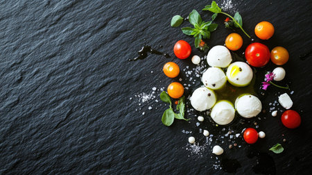 A vibrant display of mozzarella cheese and cherry tomatoes arranged artistically on a textured black slate background, perfect for food photography.