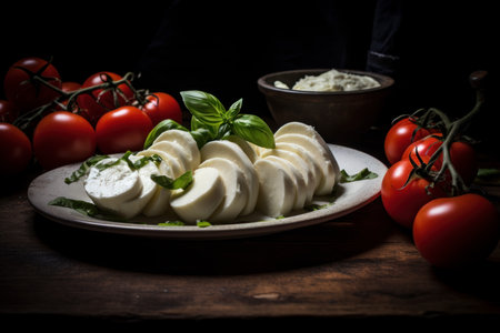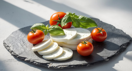 AI Generated. Mozzarella Cheese with Tomatoes and Basil on Slate for Culinary Use