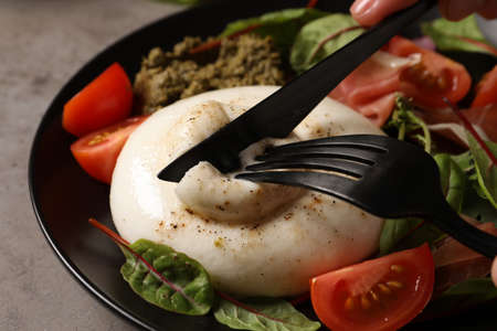 Tasing of fresh italian cheese mozzarella di buffalo close up