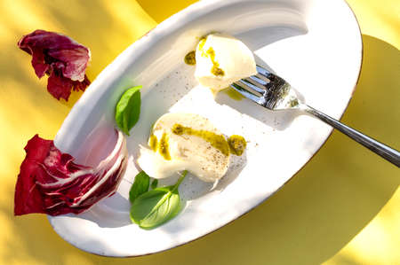 Plate of fresh burrata dish with red chicory and sweet basil leaves on the side