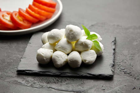 Small mozzarella cheese balls with ripe tomatoes on black slate board over dark concrete background, italian food