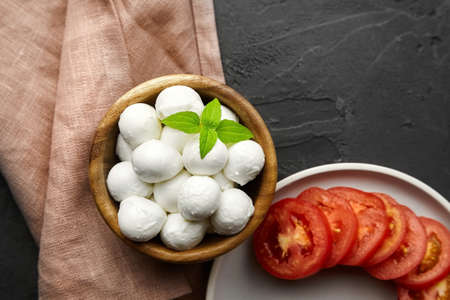 Mozzarella cheese balls in wooden bowl and fresh ripe tomatoes on linen napkin over dark stony background, top view