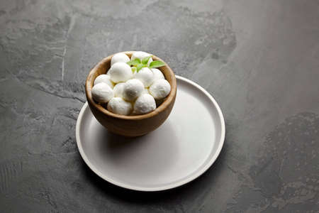 Mini mozzarella cheese in a wooden bowl with Basil leaves. gray background. Top view. Copy space.