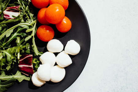 Mozzarella cheese, basil and tomato cherry on black stone tabe copy space. Ingredients for Caprese salad