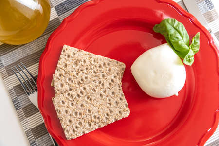 White ball of Italian soft cheese Mozzarella di Bufala Campana served with fresh green basil and red tomato