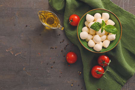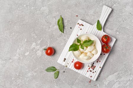 Top view of small balls mozzarella cheese and Cherry tomatoes with basil leaves as ingredients for vegetarians meals on gray concrete background with copy space