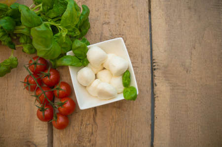 Cheese collection, white balls of Italian soft cheese mozzarella served with fresh red tomatoes and green basil