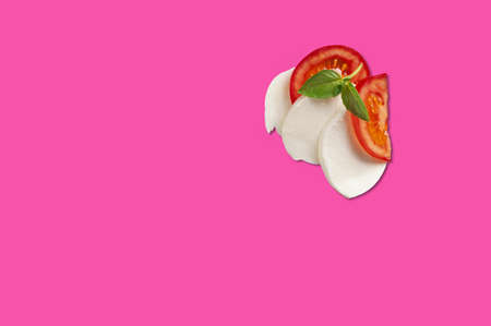 Soft white Italian cheese Mozzarella buffalo served with fresh tomato and green basil leaves on white background