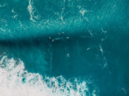 Aerial view of surfers in tropical blue ocean with waves at Bali island. Top view