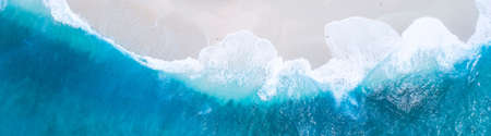 Tropical sandy beach with wave and turquoise water,copy space for text, aerial view. Ocean with waves and tropical beach. Summer and travel vacation concept