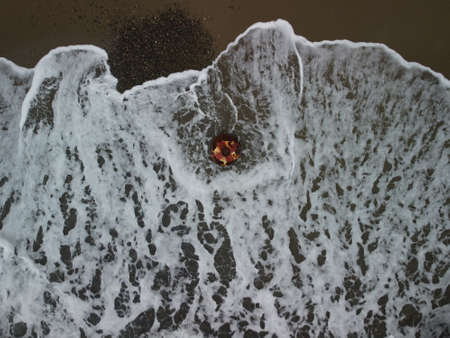 Aerial view from above on old rusty floating marine mine on the beach and volcanic rocky shores. Small waves on water surface in motion blur. Nature summer ocean sea beach background. Nobody.