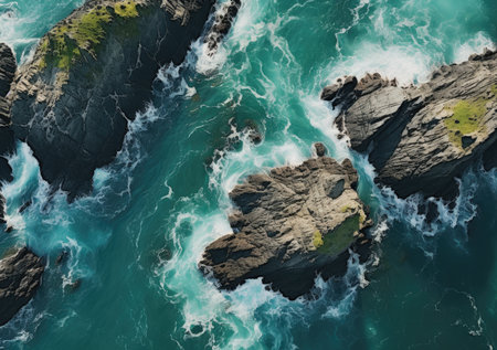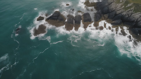 Aerial View of Turquoise Ocean Water and White Waves Crashing on Rocky Shore, Unique aerial depiction of the rocky ripple caused by the rough sea, AI Generated