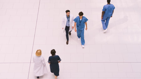Overhead View Of Medical Staff Crossing Lobby Of Modern Hospital Building
