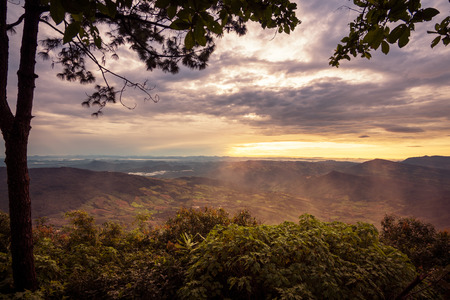 The mountain ridges with sun light, sunset sky and the blurred rock forground. Location place Phu Kra Dueng National park of Thailand