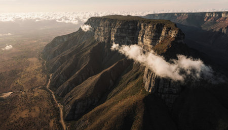 These stunning cliffs tower over a sprawling valley, with wisps of clouds clinging to the rocky faces. The warm glow of the setting sun casts shadows on the landscape, creating a dramatic scene.