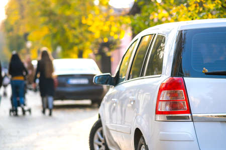 Cars parked in a row on a city street side on bright autumn day with blurred people walking on pedestrian zone.