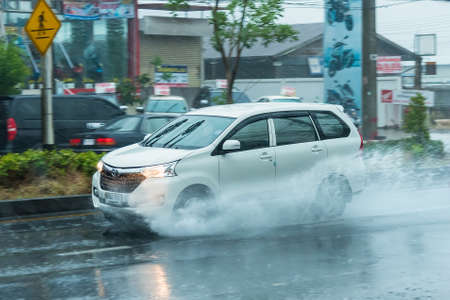 Bangkok, Thailand - April, 25, 2020 : Rainwater spraying from motion car wheels. city road during heavy rain at Nonthaburi, Thailand.