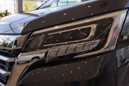 Close up of modern sedan headlamp. Front view shot from side of vehicle. Car headlight background.