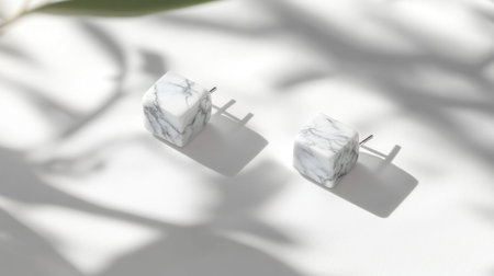 Discover elegant minimalist marble earrings that cast soft shadows on a pristine white surface, accentuated by a subtle green leaf backdrop. Perfect for showcasing style.