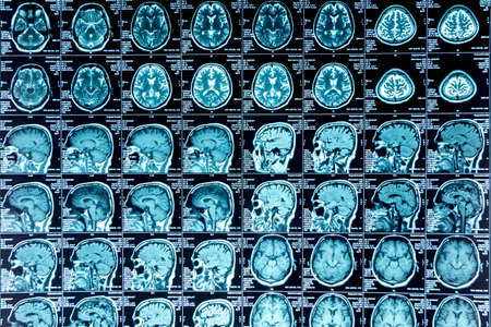 closeup series of MRI images of head and brain, magnetic resonance imaging scan, world cancer day concept