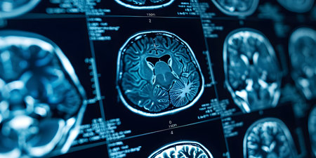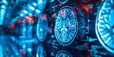 Medical diagnostic screens display detailed brain MRI scans, highlighting AI's role in enhancing precision and speed in healthcare diagnostics
