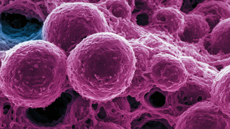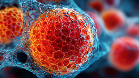 Vibrant cellular structures exhibit complex textures and shapes, highlighting their intricate patterns and colors. This close-up reveals the beauty of biological elements in a vivid manner.