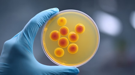 Close-up of a laboratory hand holding a petri dish containing circular bacterial colonies on yellow agar, illustrating essential microbiological research and experimentation.