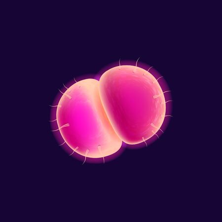 Virus cell realistic vector illustration. Pathogenic organism. Bacteria 3d isolated pink color connected round shapes. Microorganism under microscope on dark blue background