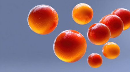 Bright, translucent spheres with orange and red hues float against a blue background, creating a dynamic and abstract visual effect