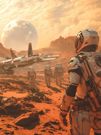 A group of astronauts walks on the reddish surface of Mars, with spacecraft nearby and a large planet visible in the sky.