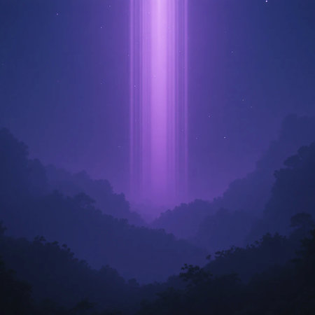 A strong, vertical purple beam of light shines down through a dark, misty forest landscape at night.