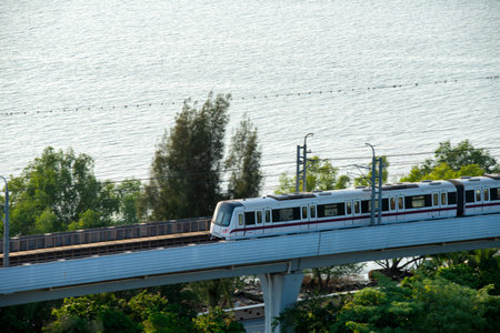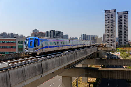 Scenic view of a public metro train (Airport Link) traveling on elevated rails by residential towers under blue sunny sky in Zhongli District, Taoyuan, a fast developing county in north Taiwan
