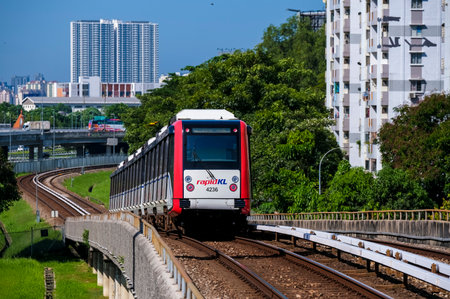 KUALA LUMPUR, MALAYSIA - FEBRUARY 21, 2020 : Malaysia Light Railway Transit (LRT) train operated by Rapid Rail or RapidKL. People commute with LRT as transportation to work, travel and shopping.