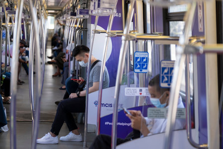 Bangkok, Thailand - 30 Jul 2020, The local Thai people transports inside the train of Bangkok (Mass) Transit System on the midday period, Bangkok, Thailand.