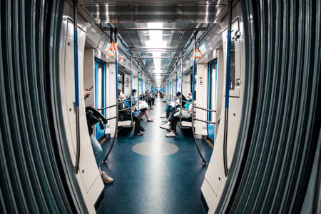Moscow. Russia. August 29, 2020 The interior of a half-empty Moscow metro car. Passengers in protective masks. Necessary measures to protect against coronavirus infection