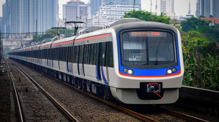 A close-up view of a Jakarta MRT train showcasing its modern design against the urban skyline, emphasizing efficient public transportation in the city.
