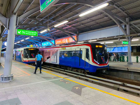 Bangkok Thailand 30 Oct 2020: A train waiting passengers at the Bearing station in Bangkok, Thailand. Each train of the mass transport rail network can carry over 1,000 passengers.