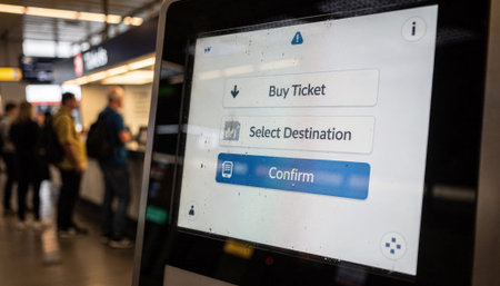 Closeup on a digital ticket kiosk screen in sharp focus while the waiting customers and ticket counter behind remain out of focus.