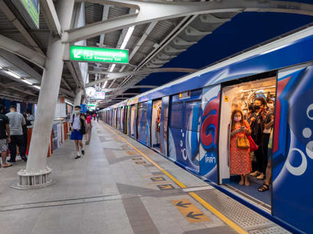 BANGKOK THAILAND - OCTOBER 01, 2021: At BTS Skytrain . The Bangkok Mass Transit System, people passengers in rush hour, Transportation, Bangkok Thailand.