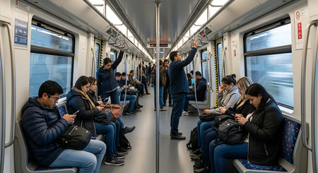Passengers on a modern subway train, many using phones, sunlit, urban commute scene.