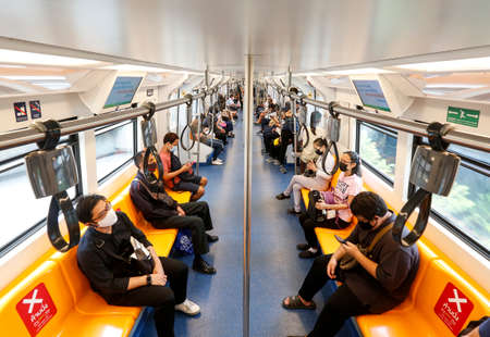 Bangkok, Thailand - 11 Apr 2020: Bangkok Airport Rail Link (ARL) in Coronavirus (COVID-19) period. They concern social distancing policy by marking tape on seats &floor in the train. Bangkok, Thailand