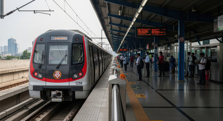 The Jakarta MRT station buzzes with activity as trains arrive amid the busy urban skyline at dusk, capturing the vibrant energy of city life and modern transportation.