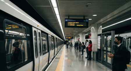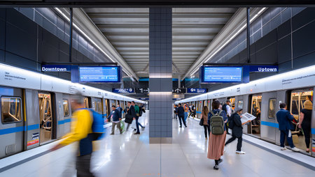 A bustling subway station platform filled with people waiting and boarding trains, showcasing urban life in motion