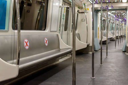 Interior of an empty seats of metro rail carriage with red cross mark. Social distancing symbol during Covid-19 or Coronavirus pandemic.
