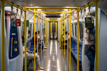 Singapore City, Singapore - September 08, 2019: Passengers in a Mass Rapid Transit (MRT) subway train in Singapore.