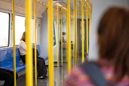KUALA LUMPUR, MALAYSIA : OCTOBER 25, 2018 : Passenger inside Malaysia Mass Rapid Transit (MRT) train. People commute with MRT as transportation to work, school, travel and shopping.