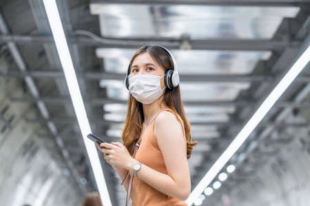 Young Asian woman passenger wearing surgical mask and listening music via smart mobile phone in subway train interchange when traveling in big city at Covid19 outbreak, Infection and Pandemic concept